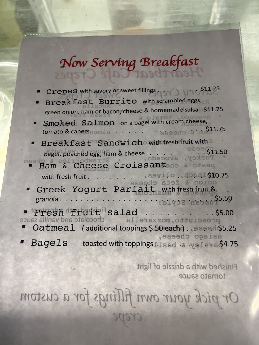 The menu at Heartbeat Cafe offers a delightful variety of dishes, with options for every taste. For those craving something sweet, the Nutella crepe provides a rich, indulgent treat. The cold sandwiches include the Italian Classic, Tuna Salad, Chicken Salad, and Egg Salad, each offering fresh and satisfying flavors. If you prefer something heartier, the hot sandwiches like the B.L.T. and Tim's Roast Beef are perfect choices. For a more gourmet option, the paninis include flavors such as Prosciutto, Chicken Breast, Ham, and Turkey, all beautifully pressed for an extra burst of flavor. The menu also features refreshing salads like the Chicken Caesar and the Spring Salad, ideal for lighter fare. Each dish offers its own unique combination of ingredients, ensuring that every visit to Heartbeat Cafe provides something new to savor.